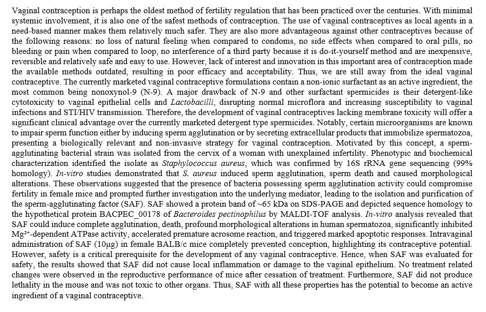 - The audience will gain insight into the identification, functional characterization, efficacy, and safety of a sperm-agglutinating factor derived from Staphylococcus aureus, highlighting its potential for development as a safe and reversible vaginal contraceptive agent.